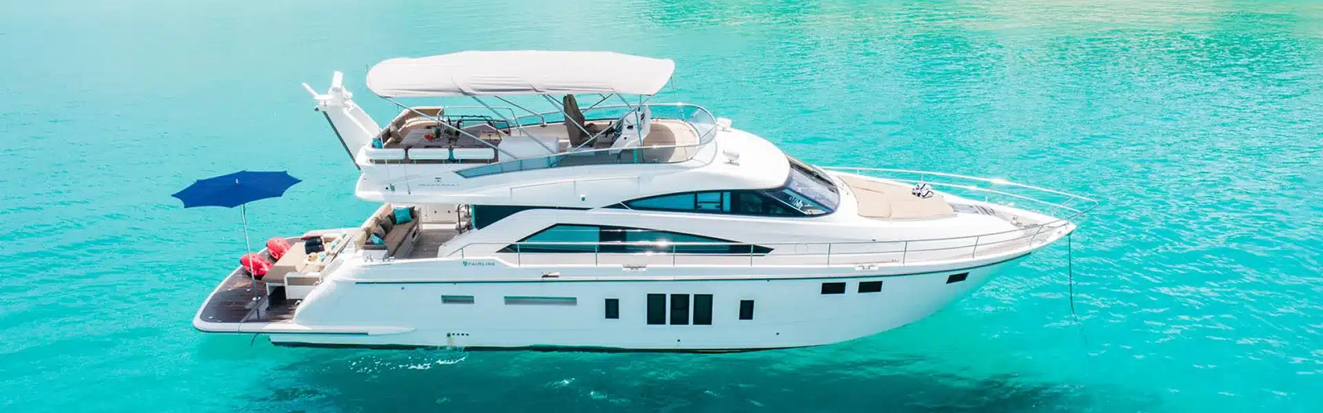 Indulge in the epitome of luxury aboard the Fairline 63. The top flybridge offers a spacious shaded hangout space, complete with a U-shaped couch accommodating 12 passengers, a custom teak table, icemaker, grill, wet bar, and refrigerator. The main floor features a relaxing aft deck couch, a welcoming and air-conditioned saloon with a retractable TV, large side windows for stunning ocean views, additional seating and a table behind the helm. The state-of-the-art bedrooms and bathrooms are spacious and modern, with a touch of nautical elegance. At the bow, a large sunbed provides the perfect spot to soak up the Caribbean sun, while the hydraulic swim platform and lounge area allow for immersive relaxation in the water.
