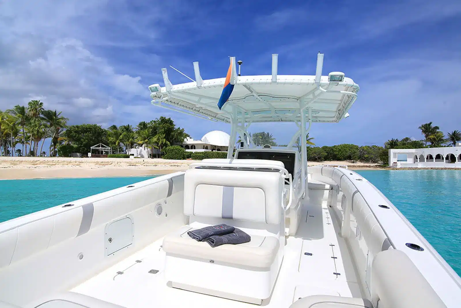 The Midnight Express is a gorgeous and comfortable powerboat for a top-notch private charter trip. This boat is known to be one of the most comfortable center consoles out there, very stable on the water, and with lots of seating. Its size allows it not only to offer an amazing charter around St. Martin, but can also bring you over to Anguilla in full comfort.