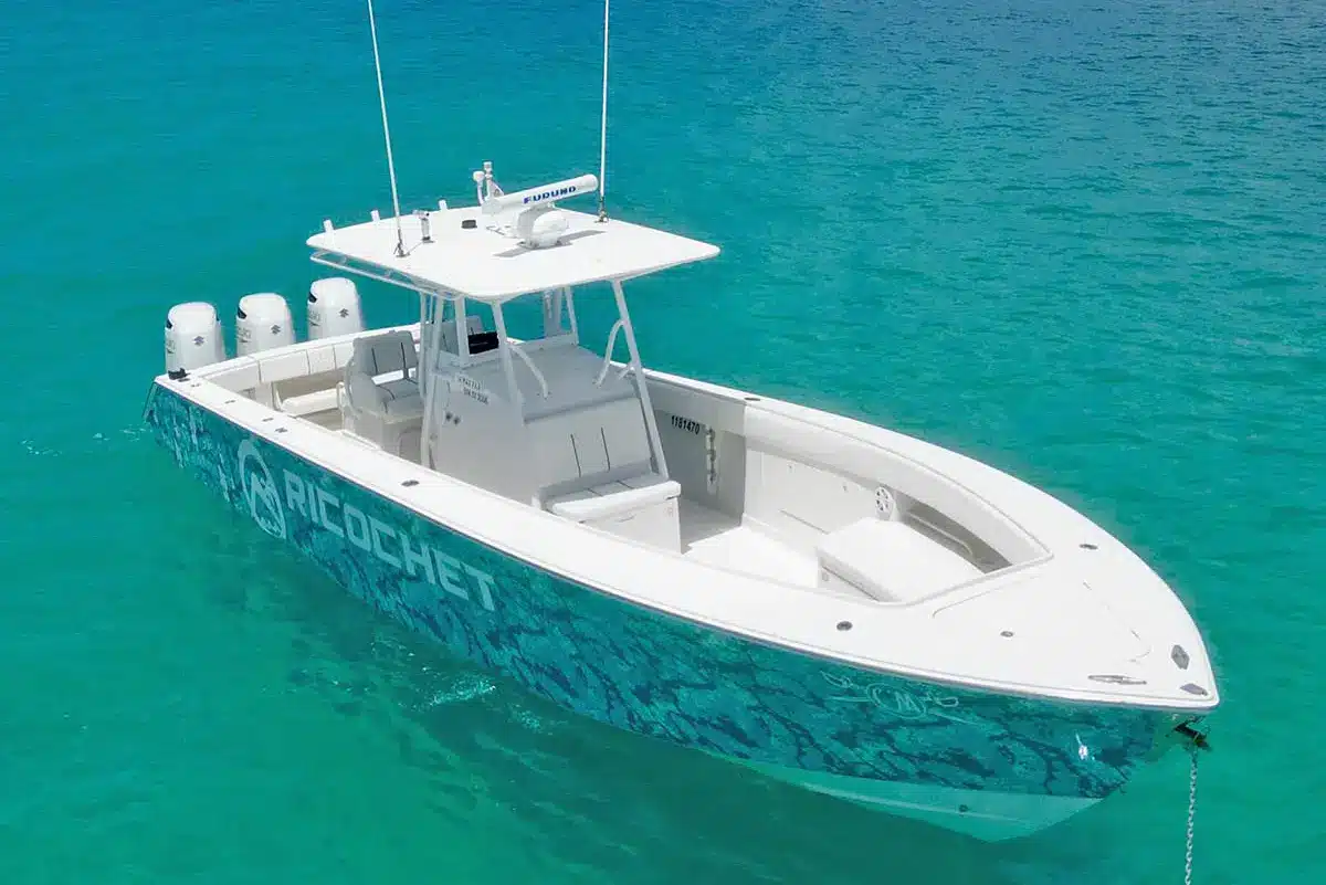 Experience the thrill of Ricochet, a 38-foot power boat featuring three 300HP Suzuki engines, a top-notch sound system, and an onboard restroom. Enjoy comfort with cushioned seating in front and back, plus a shaded lounging area with a removable awning. Ricochet offers three exclusive locations for private charters, ensuring a personalized and unforgettable voyage. Choose Ricochet for a seamless blend of style and versatility on the water.