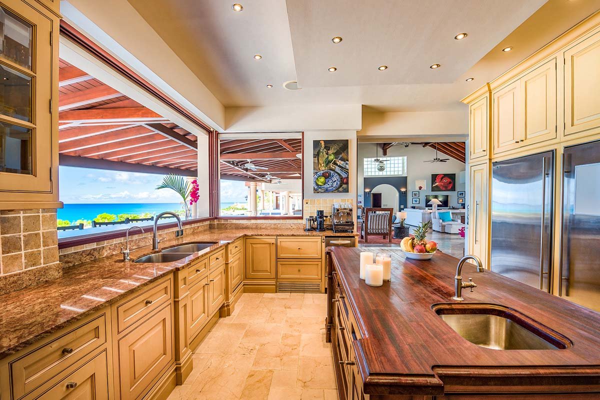 The large gourmet kitchen, attached to the Great Room, is a chef’s dream, and what better way to enjoy the kitchen than to have all your meals prepared by the in-house Chef and served by the villa’s Butler. Your only worry is what is on the menu, not who will be cooking!